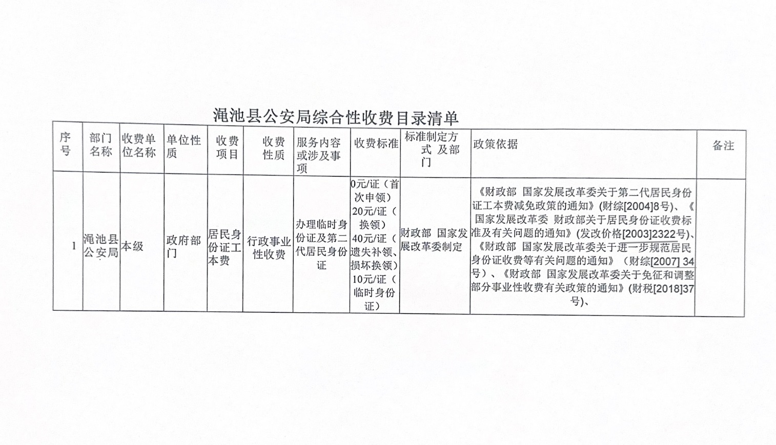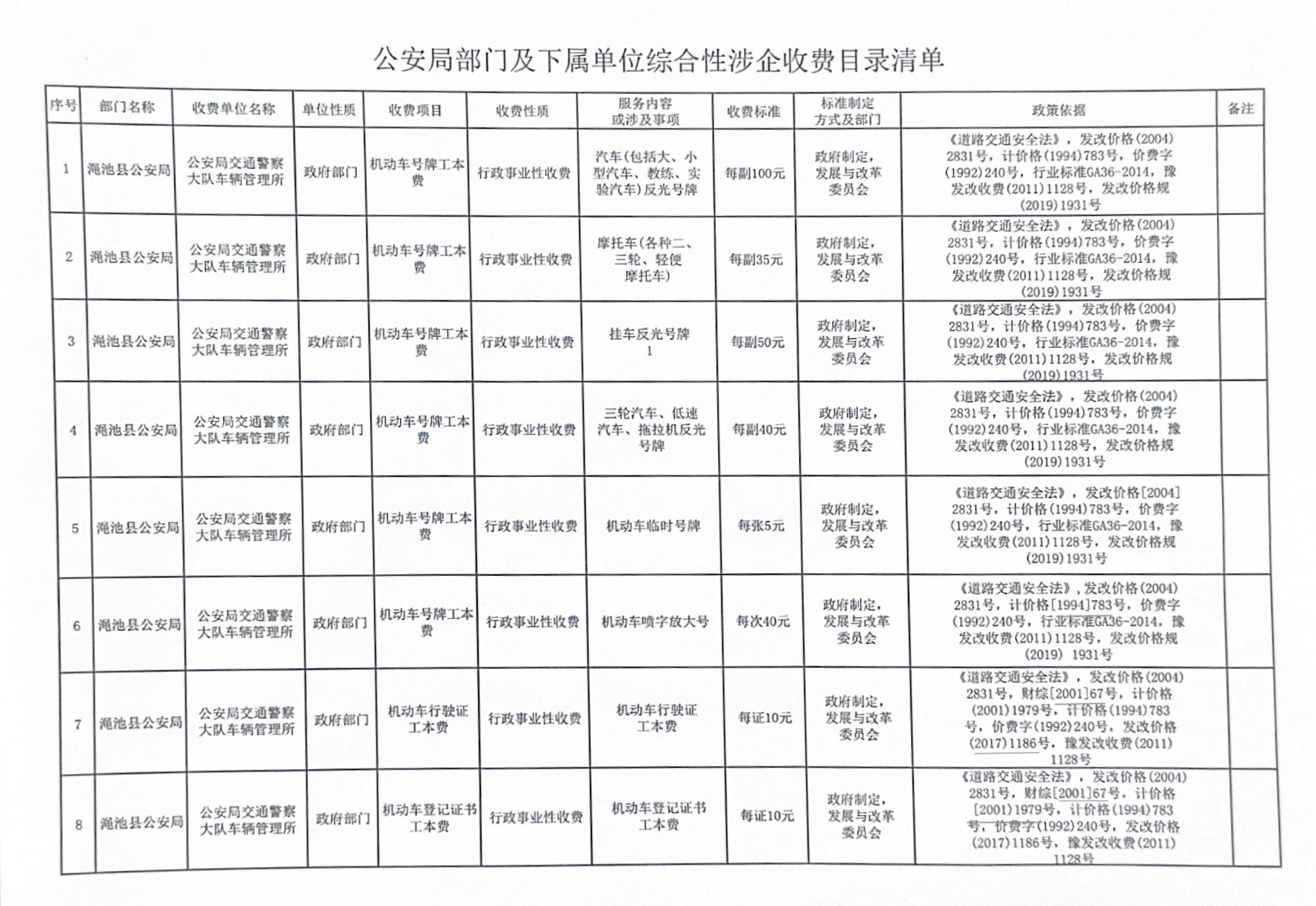渑池县公安局综合性涉企收费目录本清单